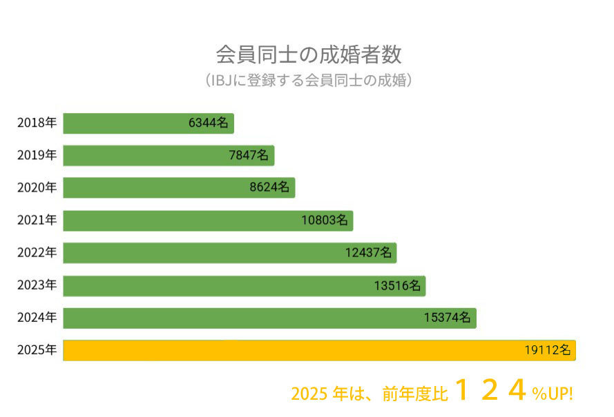 なかでもIBJに登録する会員同士の成婚は、年間19,100名以上うまれており、 前年度比で124%と年々向上していることが特徴です。